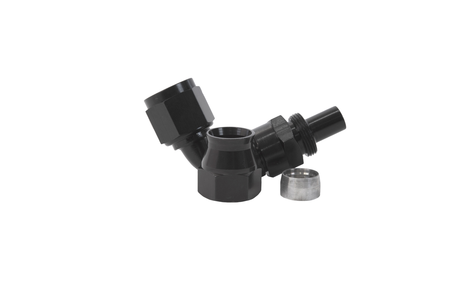 Product Description Fitting - Hose End - PTFE Racing Hose - 90 Degree - 8 AN Hose to 8 AN Female Swivel - Aluminum - Black Anodized - Each