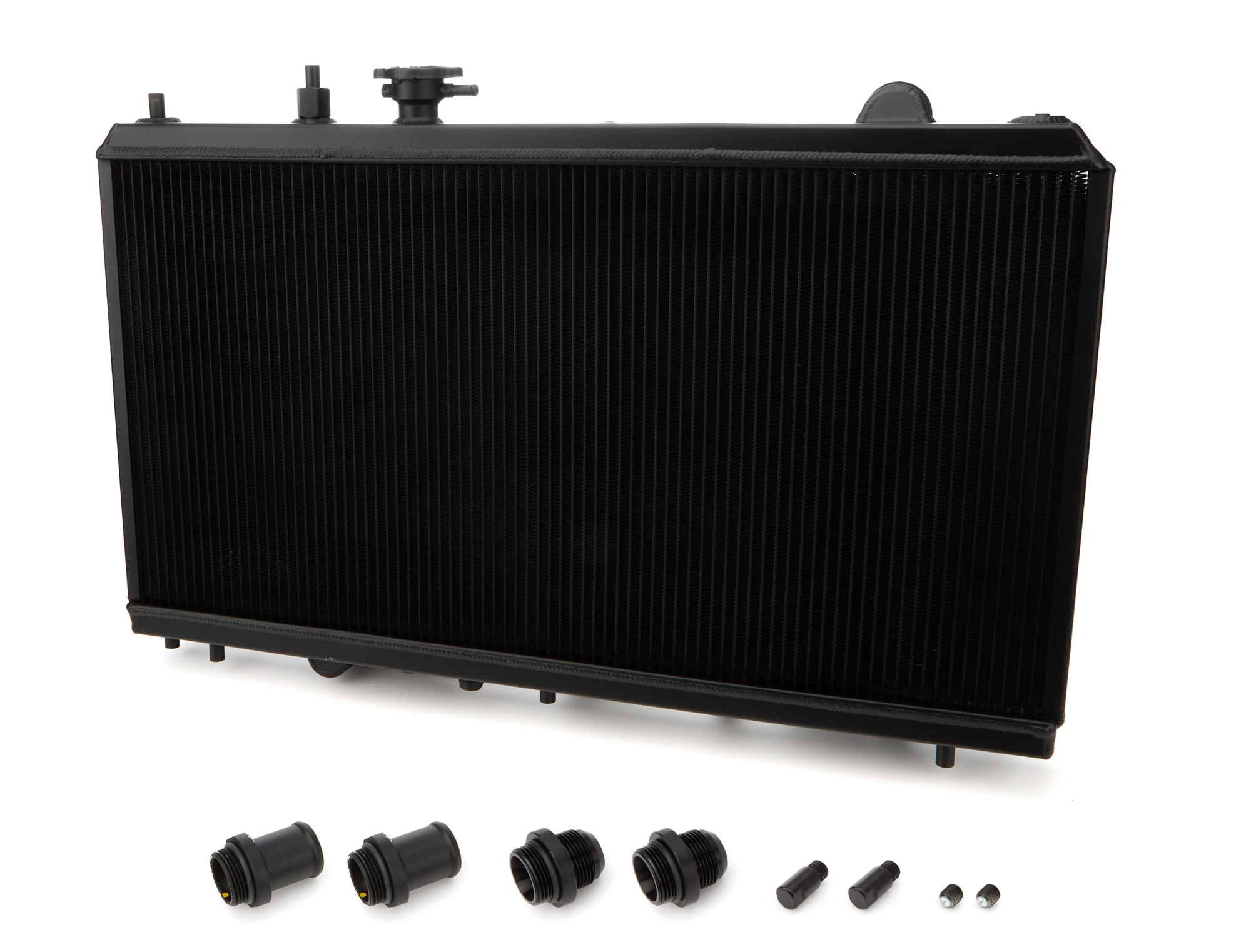 Product Description Radiator - 27.625 W x 2.375 D - Single Pass - Driver Side Inlet - Passenger Side Outlet - Aluminum - Black Powder Coat - Honda Civic 1992-2000 - Kit
