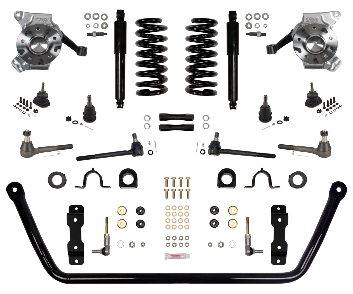Product Description Front Suspension Kit - 4-1/2 in Drop - Non-adjustable - Brackets / Control Arms / Hardware / Shocks / Springs - Black Powder Coat - GM Fullsize Truck 1971-72 - Kit