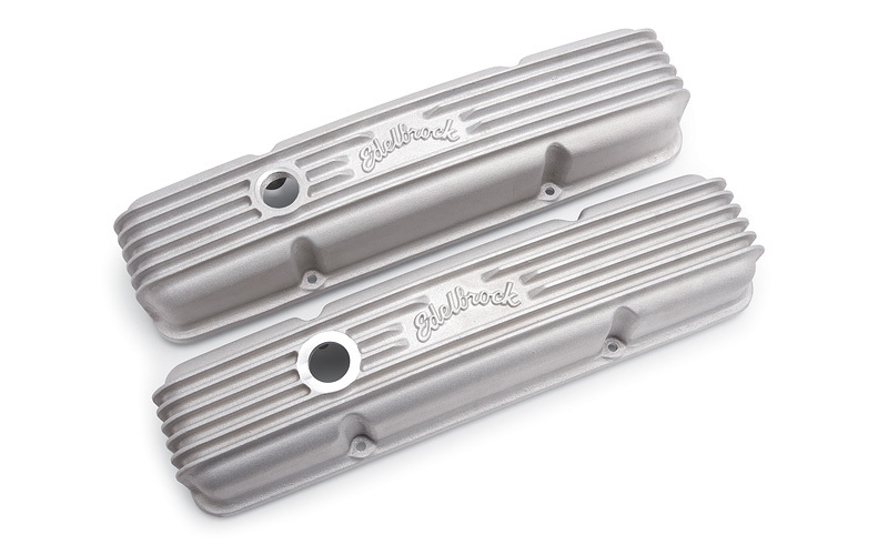 Product Description Valve Cover - Classic - Tall - Finned - Breather Hole - Edelbrock Logo - Aluminum - Satin - Small Block Chevy - Pair