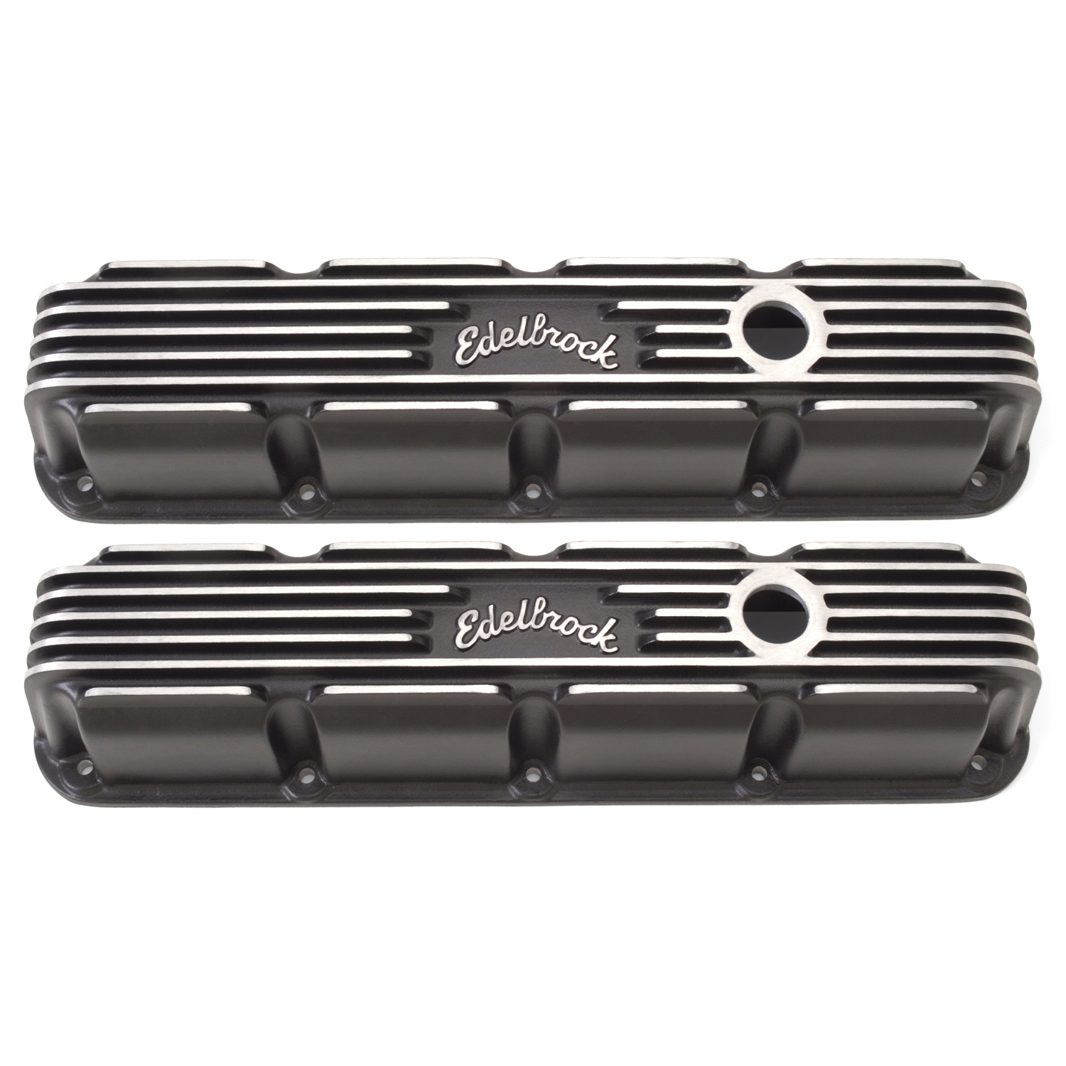 EDELBROCK Add to Cart EDE41923 BBM Classic Finned V/C's - Black MSRP: Was: Now: $401.95 Valve Cover - Classic - Tall - Finned - Breather Hole - Edelbrock Logo - Aluminum - Black Powder Coa…
