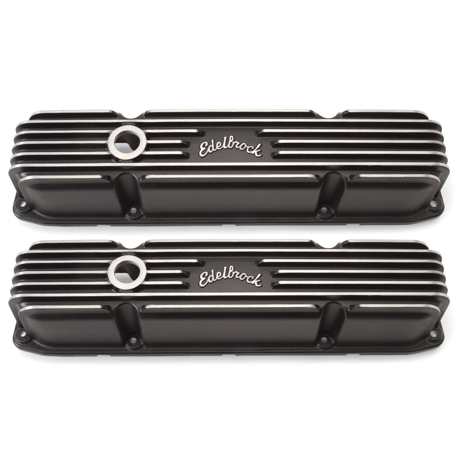 Product Description Valve Cover - Classic - Tall - Finned - Breather Hole - Edelbrock Logo - Aluminum - Black Powder Coat - Mopar B / RB-Series - Pair