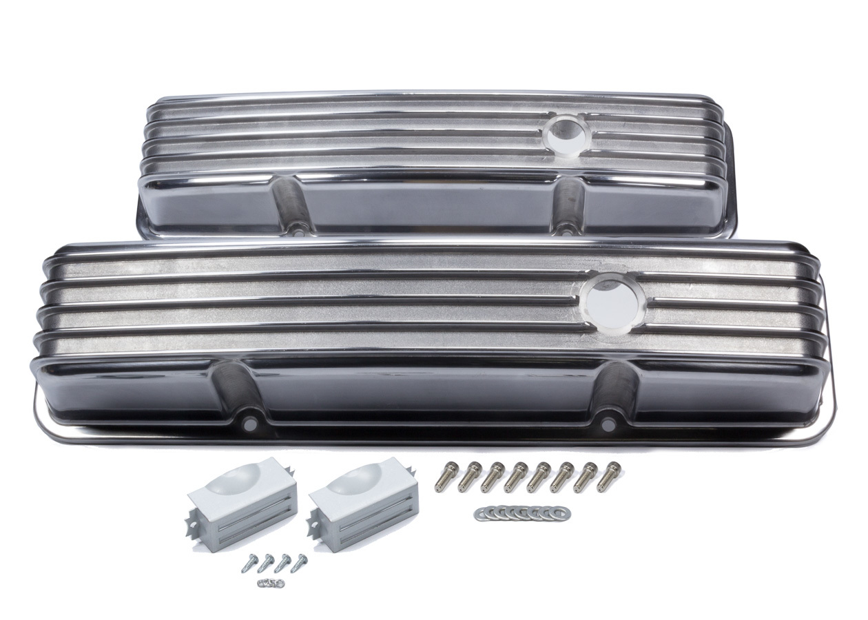 Product Description Valve Cover - Stock Height - Finned - Breather Holes - Hardware Included - Aluminum - Polished - Small Block Chevy - Pair