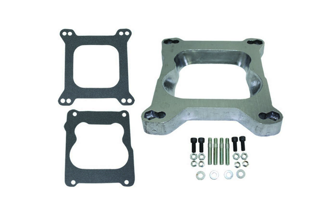 Product Description Carburetor Adapter - 1 in Thick - Open - Spread Bore to Square Bore - Gaskets / Hardware Included - Aluminum - Natural - Each