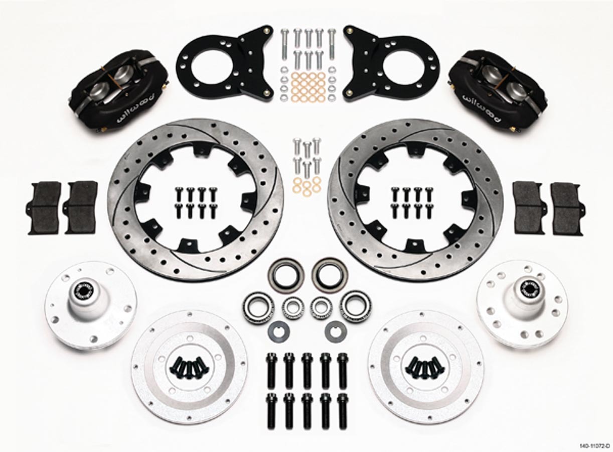 Product Description Brake System - Forged Dynalite Big Brake - Front - 4 Piston Caliper - 12.190 in Drilled / Slotted Iron Rotor - Offset - Aluminum - Black Powder Coat - Ford Mustang 1965-70 - Kit