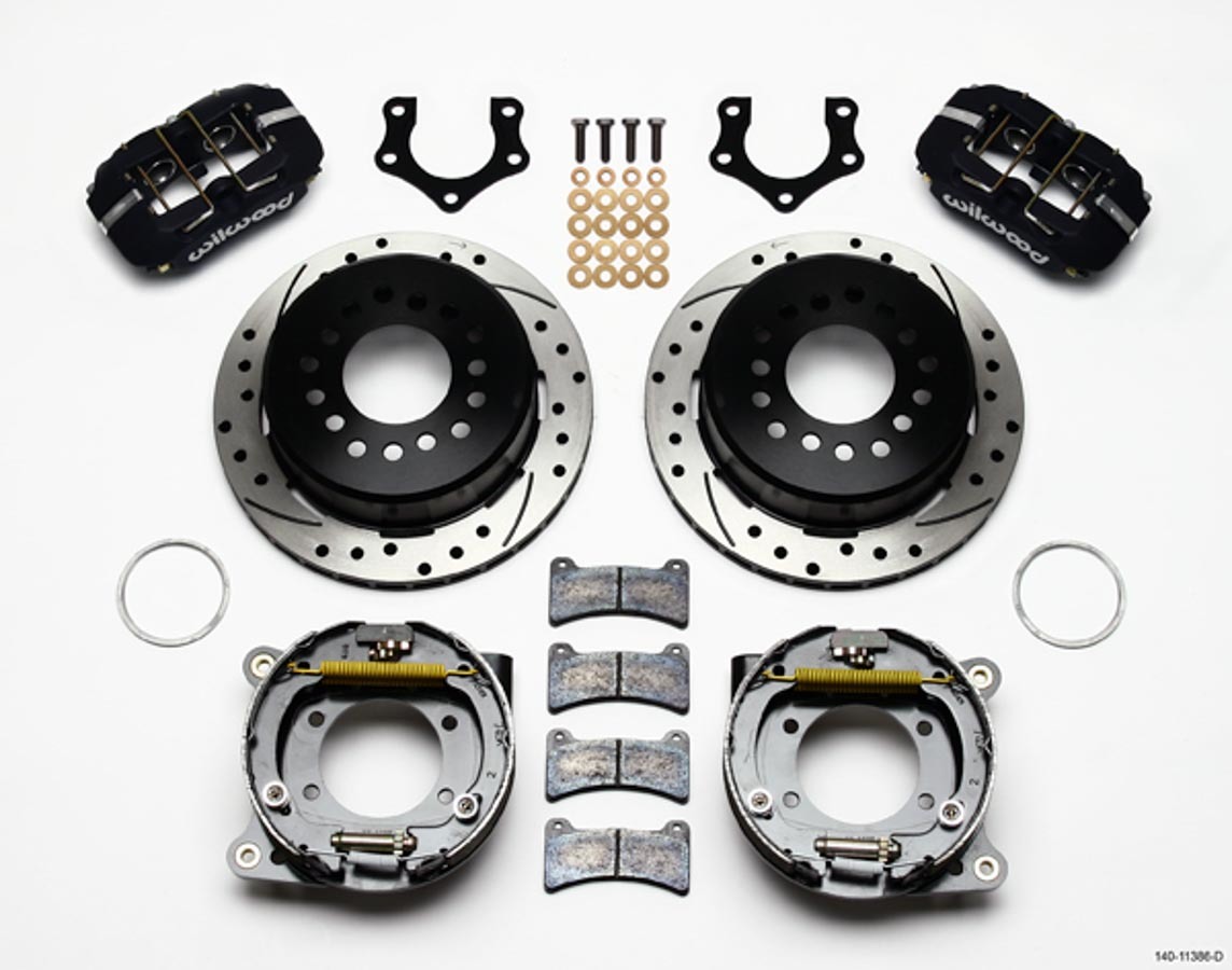 Product Description Brake System - Dynapro Low-Profile - Rear - 4 Piston Caliper - 11.000 in Drilled / Slotted Iron Rotor - Parking Brake / Offset Hat - Aluminum - Black Powder Coat - Mopar / Dana - Kit